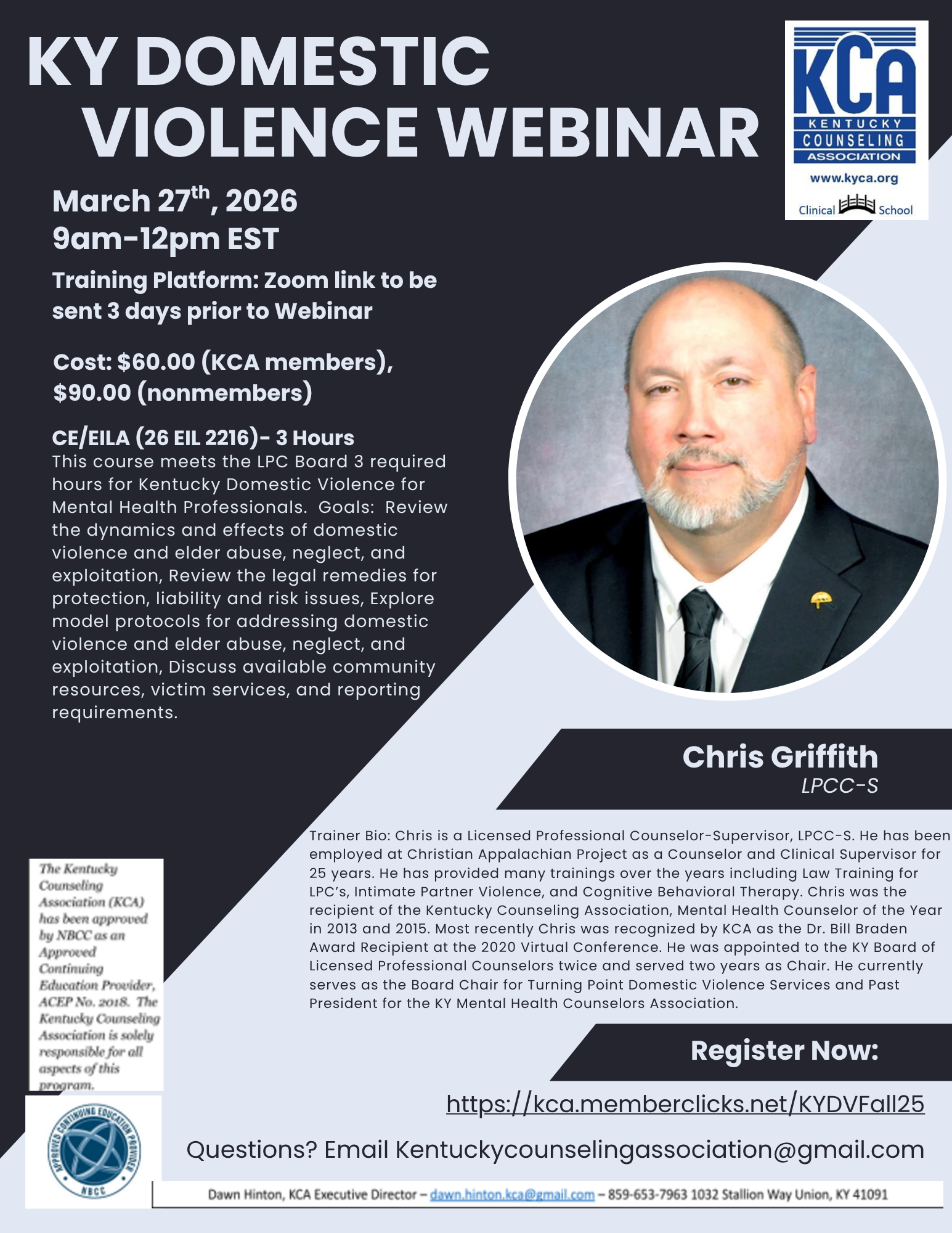 KCA is pleased to host this 3 hour Webinar Domestic Violence with Mr. Chris Griffith