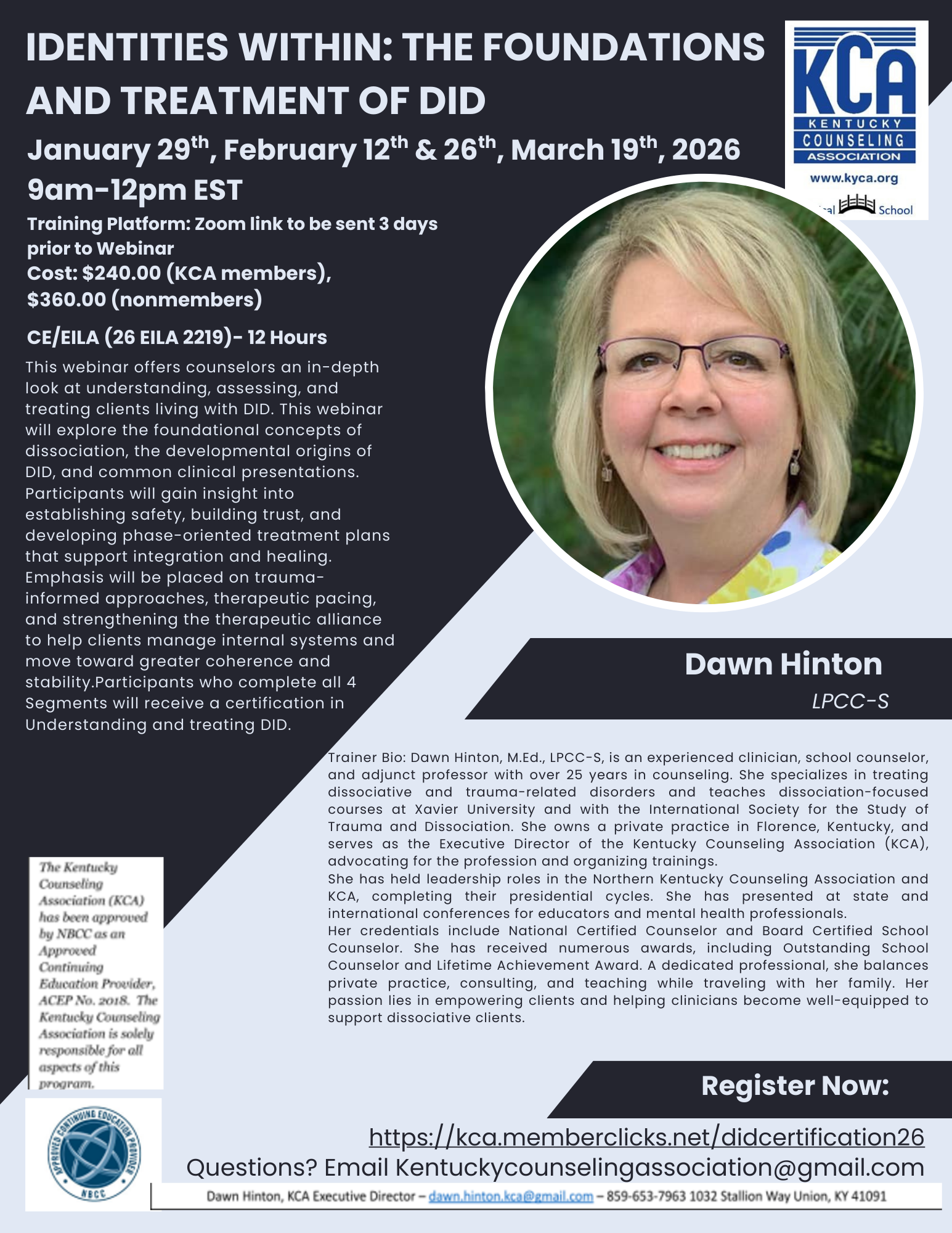 KCA is pleased to host this 12 hour webinar series Identities Within: The Foundations and Treatment of DID with Dawn Hinton. The full certification will be 12 hours, divided into three 4 hour segments on the following dates: January 29th, February 12th & 26th, March 19th, 2026 from 9am-12pm EST.
